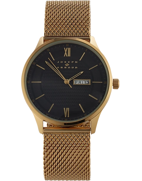 - Gold-tone finish|Stainless steel bracelet and case back|Analog|Second hand|Date window|Roman numerals & hour markers|Joseph Abboud|