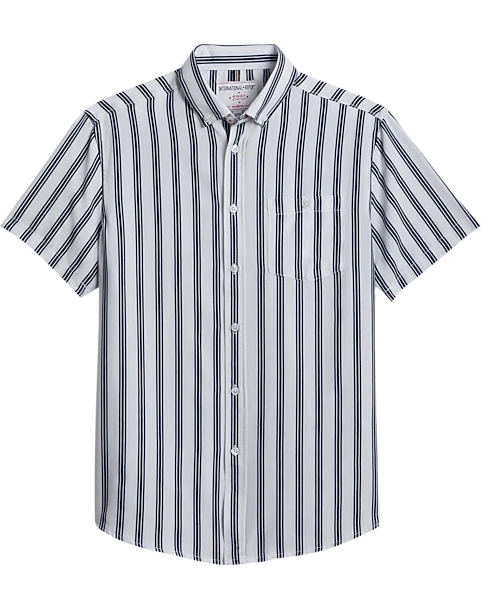 Woven with comfortable four-way stretch fabric, this sport shirt from the Report Collection keeps up with your every move while retaining its shape for the perfect fit. With short sleeves and classic stripes, it is both breathable and stylish.